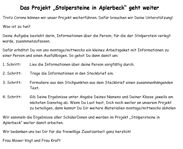 In diesem Schuljahr konzentriert sich diese AG auf den Schulstandort Aplerbeck. Neben der Beschäftigung mit dem jüdischen Leben in Aplerbeck bis 1945 erarbeiten die teilnehmenden Schülerinnen und Schüler die Schicksale der Personen, die hinter den 37 in Aplerbeck verlegten Stolpersteinen stehen.